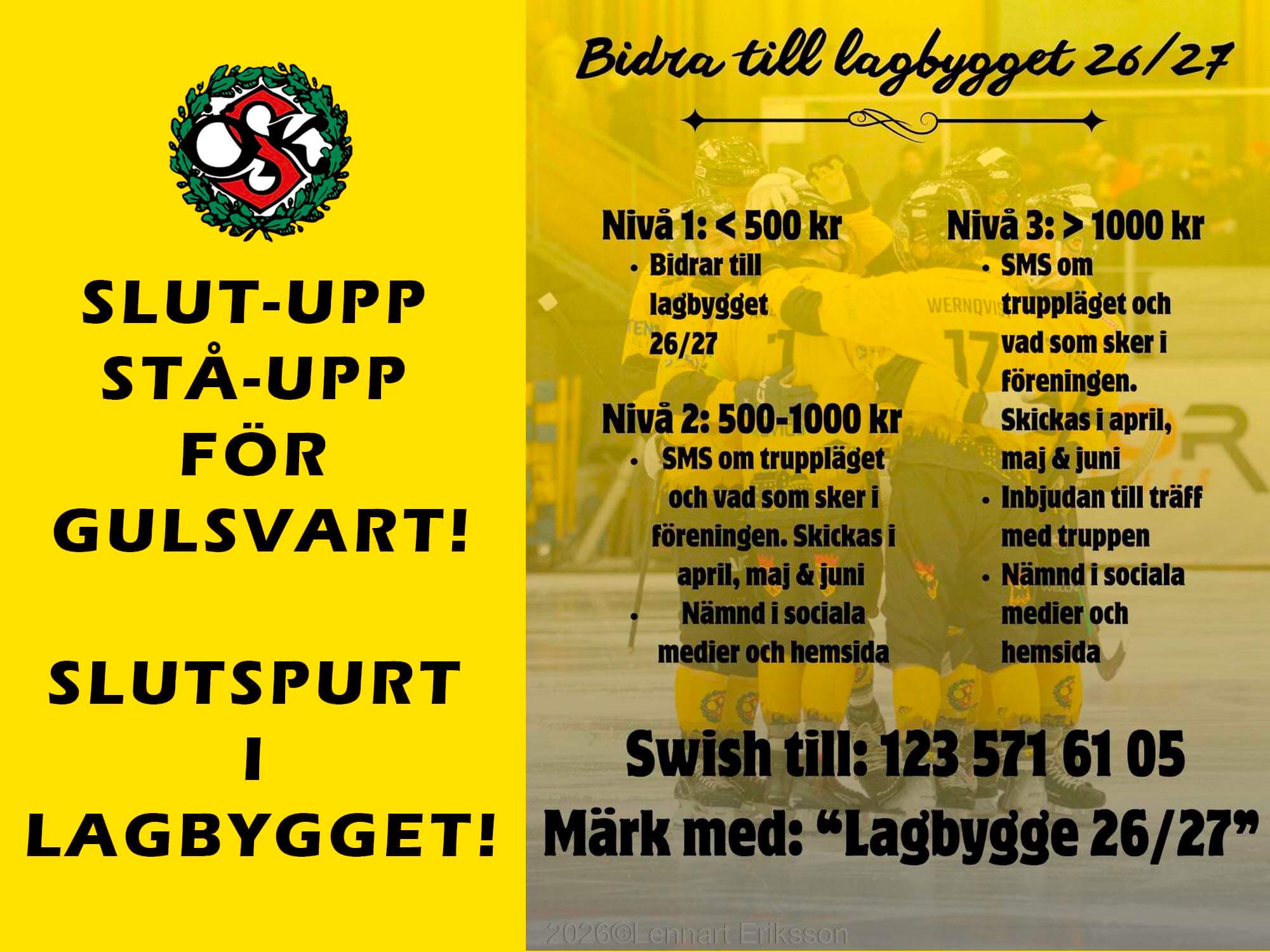 Swisha ert bidrag till 123-571 61 05. Märk bidraget med ”Lagbygge 26/27”.